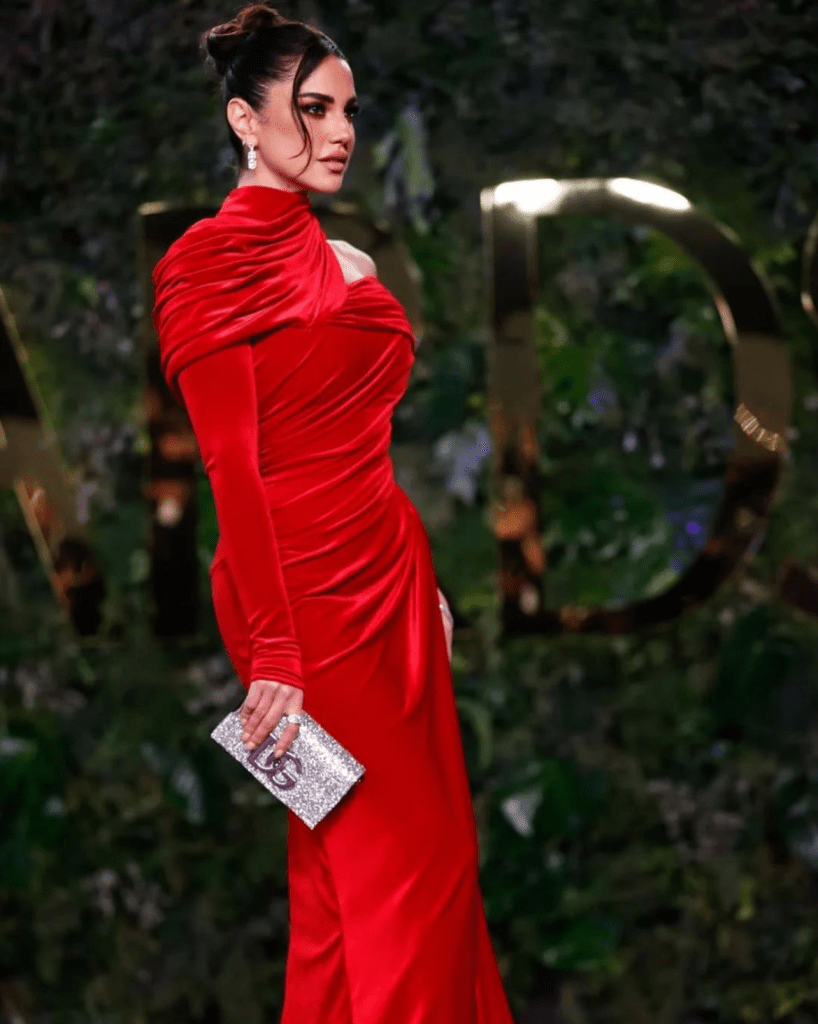 For the Arab Women of the Year Awards in London, Nour Arida delivered a modern take on velvet glamour. The emerald off-the-shoulder dress balanced softness with intention, letting the fabric’s plush texture do most of the work. Under low city lights, the velvet absorbed shadow and shine alike, creating a cinematic effect that felt effortless yet considered. This was velvet as modern luxury, confident, unfussy, and perfectly timed.