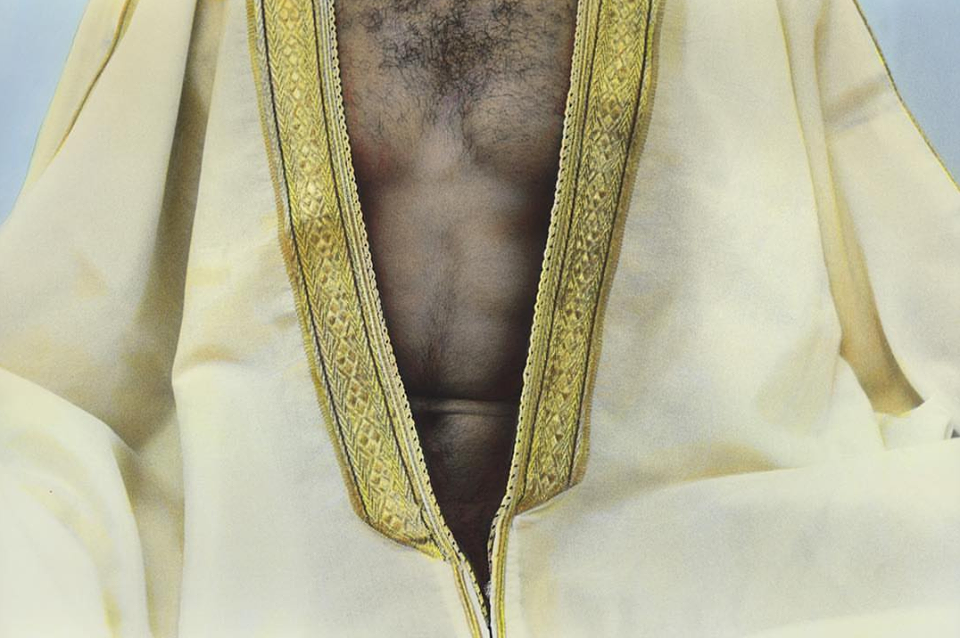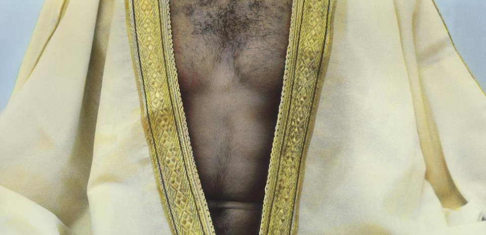 Moreover, the plunging v-neckline -typically associated with hyper-feminine attire- is utilized by Nabil to add to the play on gender in this photograph, and several others.