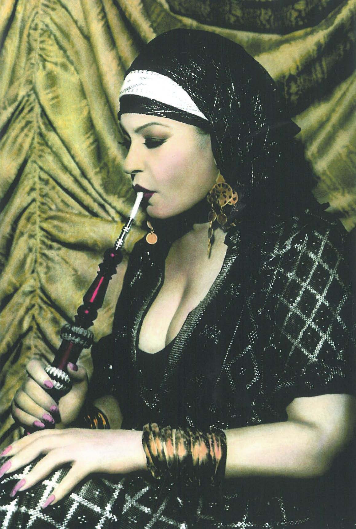 Consider the artwork above, for example, containing an image of a woman lying down wearing what looks like an elaborately decorated top half of a belly-dancing costume, and holding a shisha.